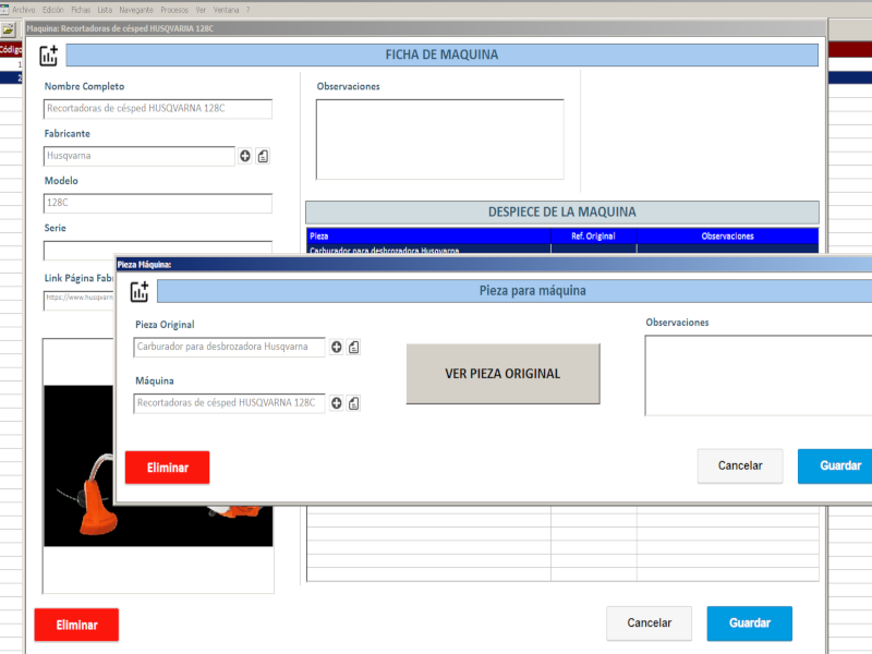 Aplicación para el control de despiece de maquinaria Otro ejemplo de Software a medida, en este caso para el control de despiece de maquinaria con ficha modelo, fabricante, máquina, pieza de repuesto, referencia de proveedor, referencia de fabricante.